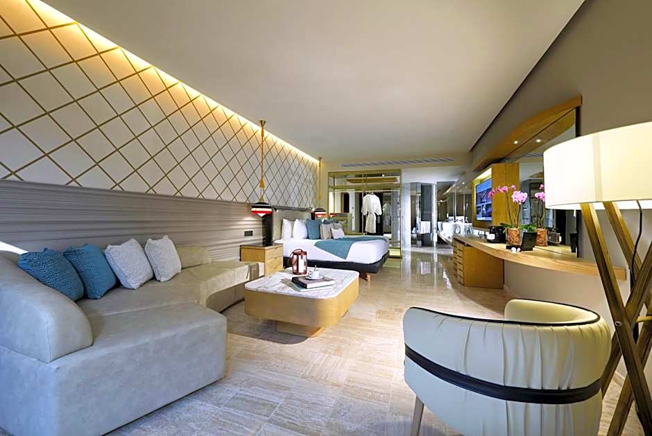 Junior Suite Private Pool Poolside is 969 square feet and includes either a king-size bed 150-183 width or 2 double beds 131-150 width plus terrace, desk, cable tv, tea and coffee making facilities , safe, bathrobes, and slippers and is Wheelchair-accessible.
